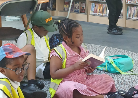 Across the school children are visiting the school library and local libraries. They are encouraged to borrow books and read them at school and home and visit the local libraries with their parents. This picture celebrates the implementation or adoption of children reading for pleasure