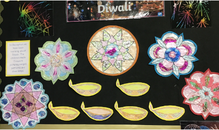 In Reception, the pupils have participated in the celebration of Diwali, a key celebration among the Hindus in our community. Drawing on their knowledge of colours, the completed exquisite design of Rangoli, and transformed their classroom environment. They also made traditional oil lamps, an important celebration of knowledge in the Hindu religion. This picture captures our immersive approach to learning.