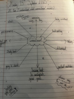 Year 6 pupils looked closely at the universal concept of commitment both as a foundation of religious beliefs (using practices in Islam as a case study) and as an important part of personal discipline (humanism). They learned that underneath every success is the trait of commitment - when you are disciplined (committed) and stick to it. This picture shows one pupil’s clear understanding and personal reflections of what commitment entails.