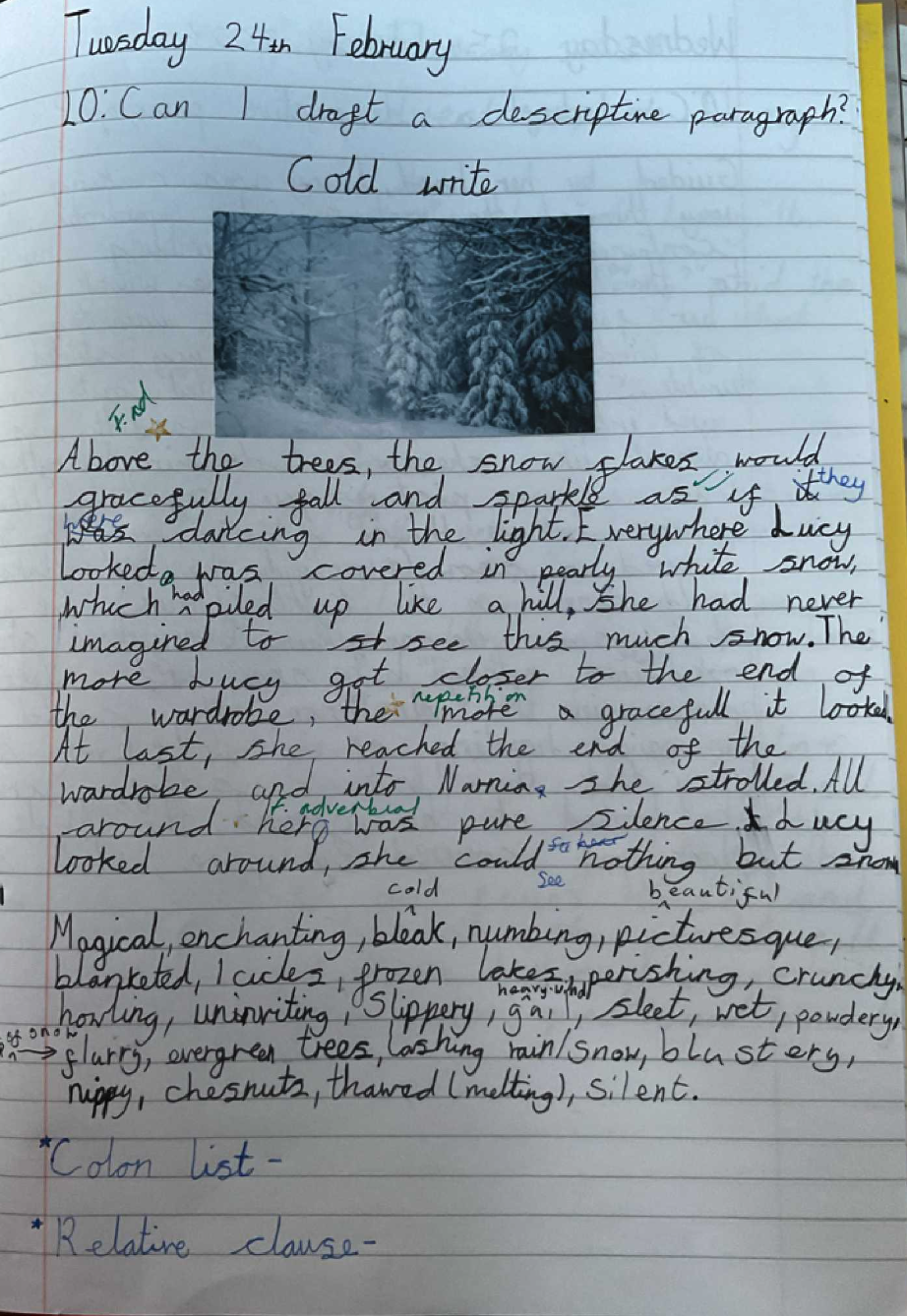 Evidence from the English books reviewed during our moderation session with James Wolfe and Invicta Primary clearly demonstrates that pupils are making sustained progress. Through precise and rigorous instruction, those students on the cusp are showing significant development, reflecting the impact of high-quality teaching.