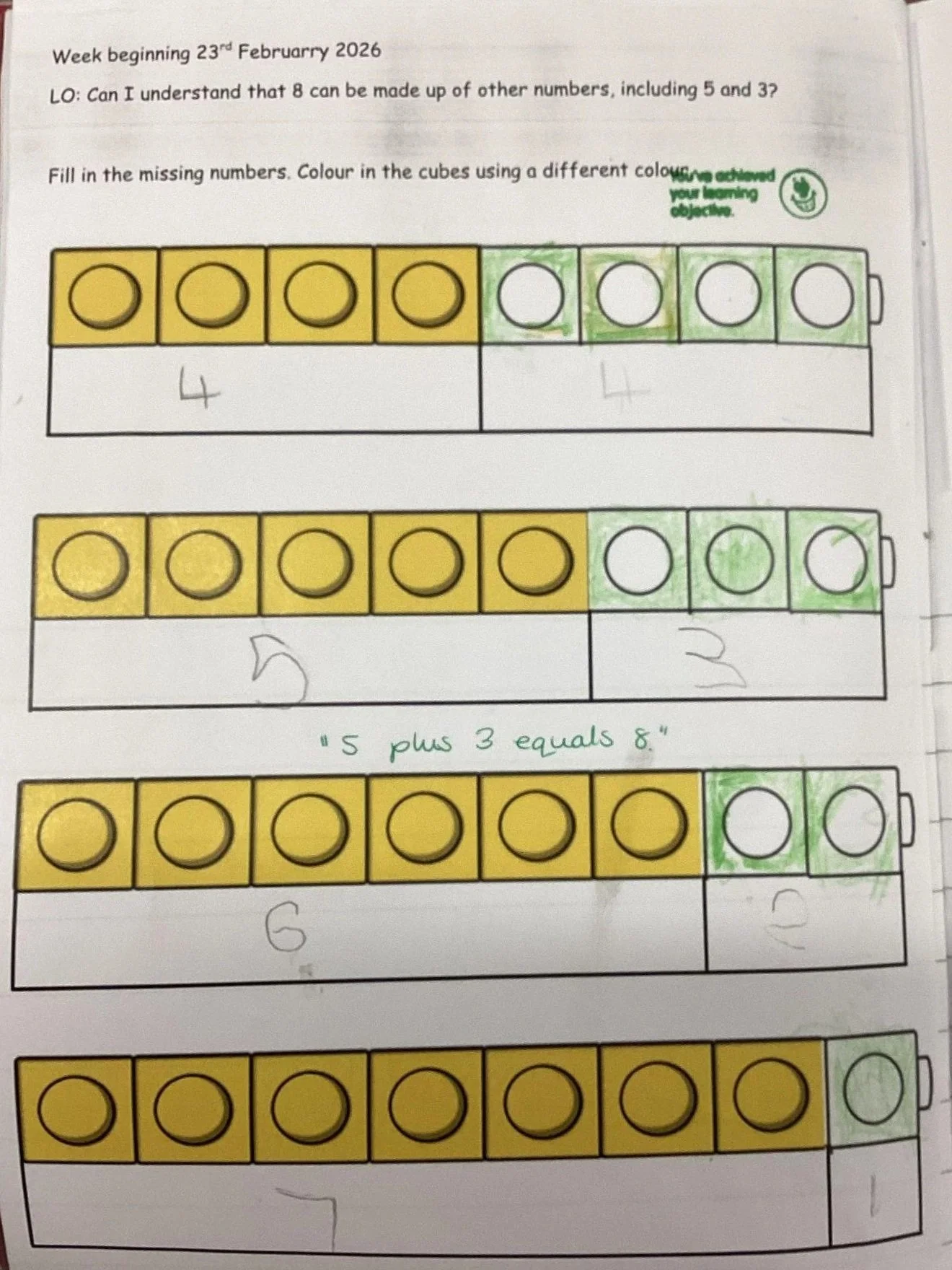 In KS1, children have been consolidating their knowledge of addition in a variety of ways before moving to subtraction. They have used a range of manipulatives to support their understanding including, counters, compare bears, dominoes, number lines, part - part whole models and the bar model. Children have also applied their understanding t being able to solve simple word problems.
