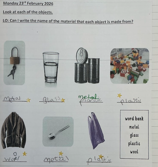 Year 1 is exploring Material Chemistry. They are identifying the different materials everyday objects are made of and reasons behind the choices. This is the first stage in their learning of materials, qualities and purposes.