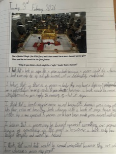 In this unit, pupils explored the central role of the Guru Granth Sahib within Sikhism, focusing on its significance as both a sacred text and a living leader. Pupils examined why the sacred text is elevated on a palki (throne) within the Gurdwara. To deepen their understanding, the pupils tackled complex evaluative questions, such as: What constitutes a sacred text? Why might a book be considered a more reliable or "safer" leader than a human being? This photograph celebrates a pupils personal reflection on the significance of learning from a written text?
