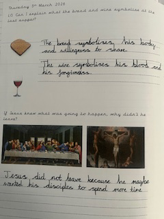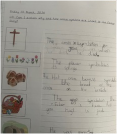 Throughout the school, pupils have used enquiry-based learning to investigate the concept of symbolism across various faiths. By asking deep, reflective questions, they have uncovered how physical items can represent complex religious ideas. In Year 2, pupils applied this concept to the Christian festival of Easter. This photograph celebrates a pupil’s ability to connect traditional Easter symbols with the core themes of beliefs and practices in Christians within our community.
